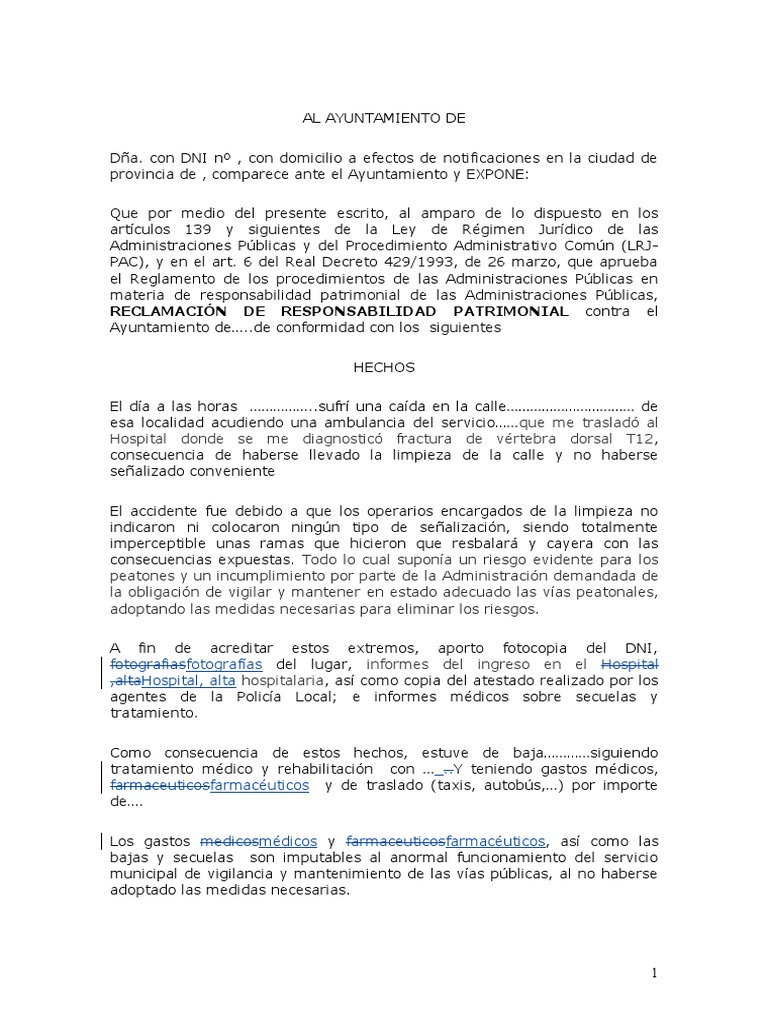 Modelo reclamacion caida via publica. Reclamacin por cadas en vas pblicas y en sitios privados. Qu debo hacer si sufro un Accidente en la Va Pblica. Modelo de reclamacin al Ayuntamiento por cada en la calle La responsabilidad patrimonial de la administracin.